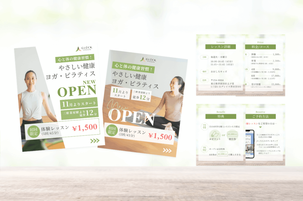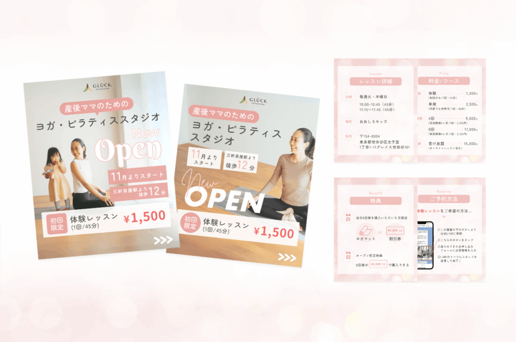 - それぞれのターゲットに合わせたデザインを作成し、一番目立たせたい初回限定の体験レッスンが一番目立つような配色とレイアウトにしました。